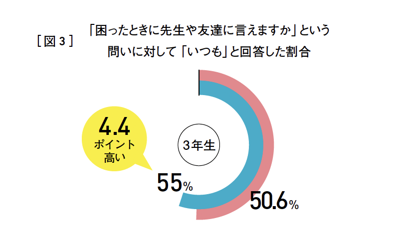 先述の山梨県の調査*でも「困ったときに先生や友達に言えますか」という質問に対して、導入後の学級のほうが、「いつも」と答えた割合が4.4ポイント高くなっている。