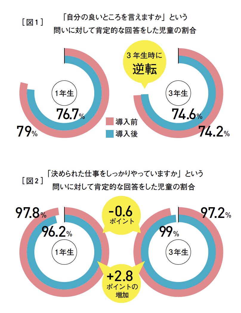 その結果、子どもたちの自己肯定感も高まっている。「自分の良いところを言えますか」「決められた仕事をしっかりやっていますか」といった意識調査の多くの項目で、導入後の学級によい影響が見られた。