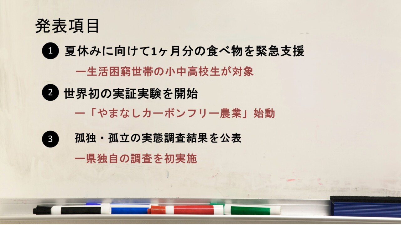 知事は、「この事業は夏休みに向けた緊急的なものであり、恒久的な支援スキームについても早急に議論を進めていきたい」と述べた。