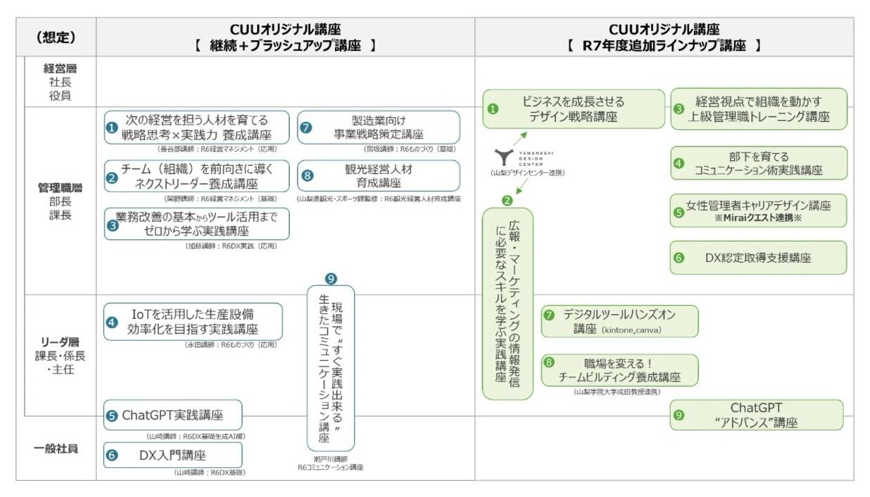 「やまなしキャリアアップ・ユニバーシティ」は、『DX実践講座』や『コミュニケーション講座』など、山梨にゆかりのある講師陣による実践的な学びの場として、2023年度に県が開設した。3年目を迎えた現在では講座のラインナップも増え、今年度はCUUオリジナルだけでも18講座を提供。初めて参加する企業も多く、新たな受講者層の広がりが見られる一方で、継続して参加する企業も少しずつ増えている。