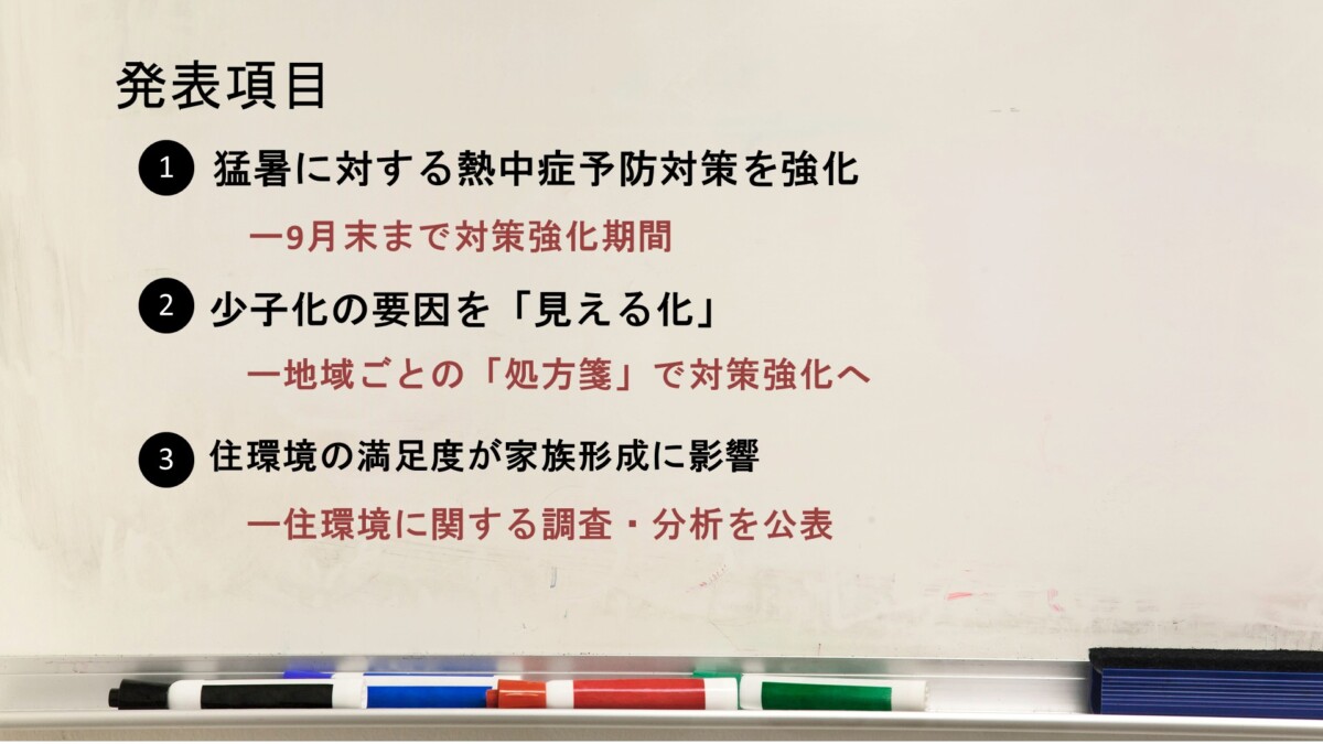 知事は8月6日の記者会見で、連日の猛暑への対応として、9月末まで県独自の「熱中症予防対策強化期間」とし、期間中の予防対策を強化していくことを公表した。