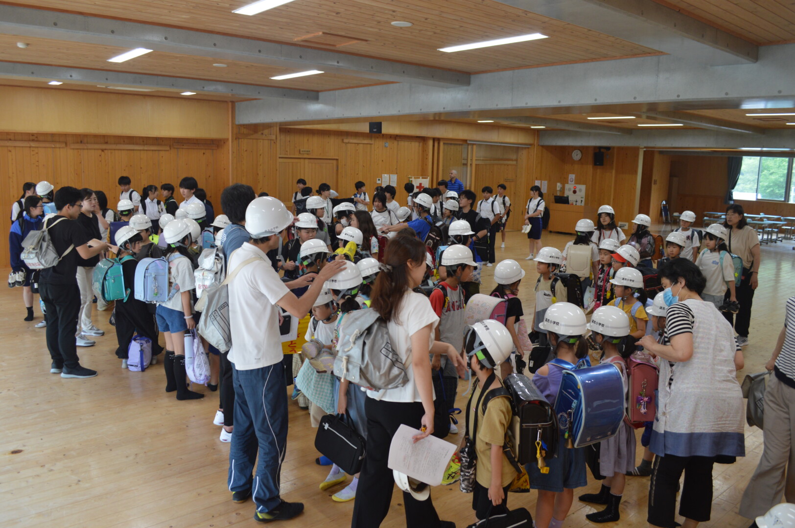 道志小学校では、避難訓練も中学校と合同で行っている。小さな児童から中学生の生徒までが一体になっていざというときに備え、保護者の引き取りも一緒にやっている。