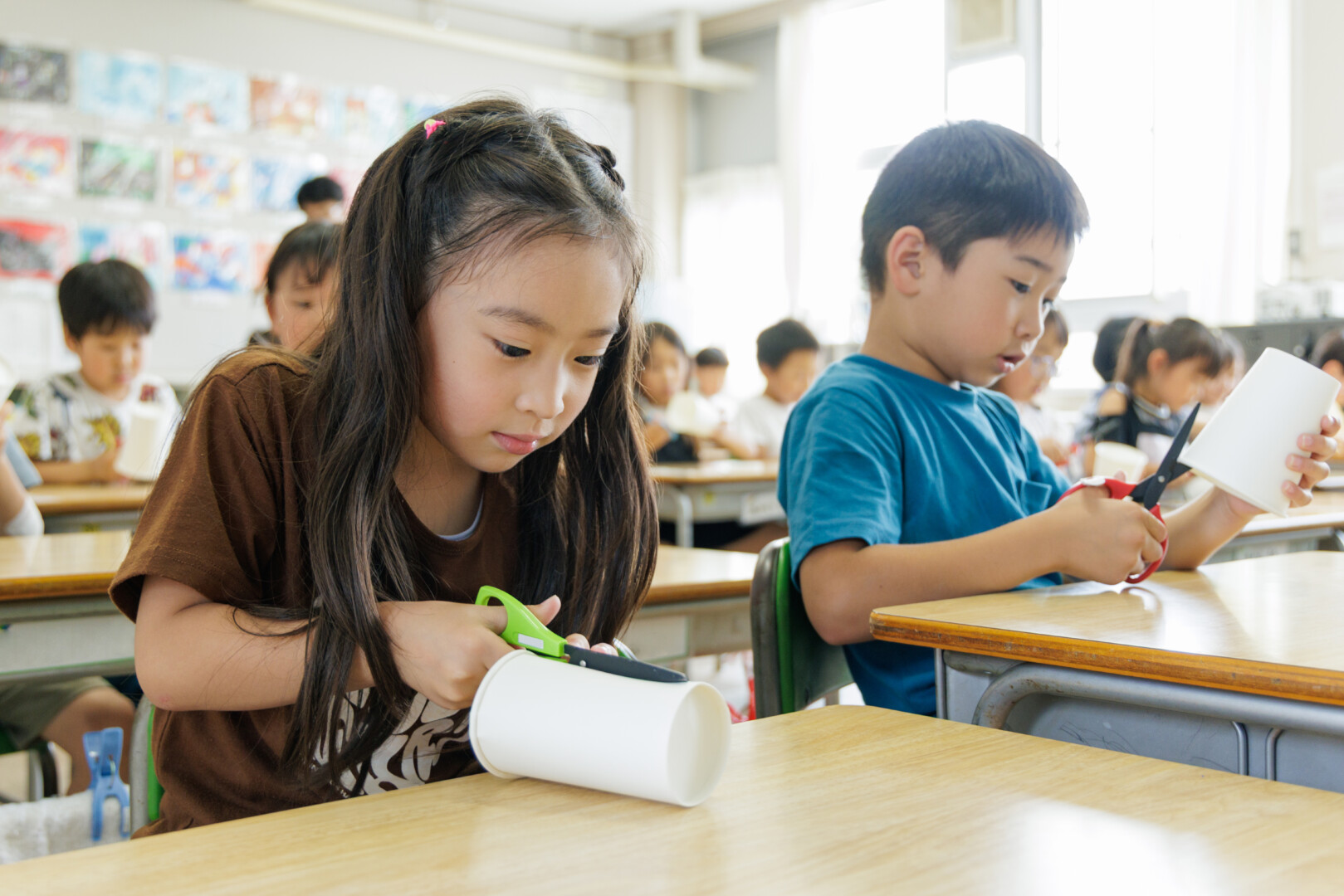 取材当日、白根東小学校1年生は図画工作の授業で紙コップを使った工作を行っていた。