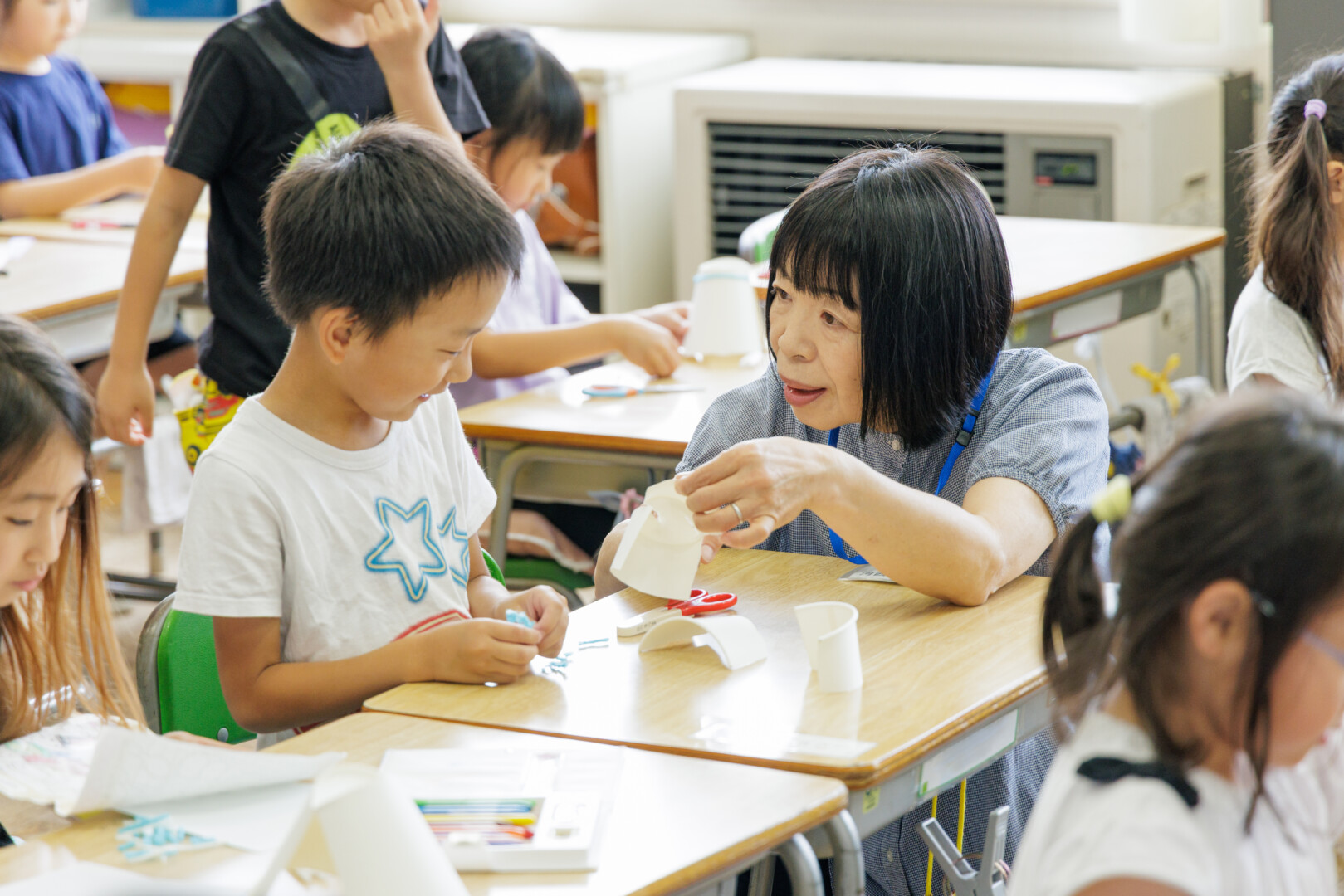 まずは、教壇で朝比奈先生が作品のつくり方や、はさみの持ち方などをていねいに指導する。工作が始まると、河西先生は朝比奈先生と一緒に教室内をまわり、作業に手こずる児童にそっと声をかける。
