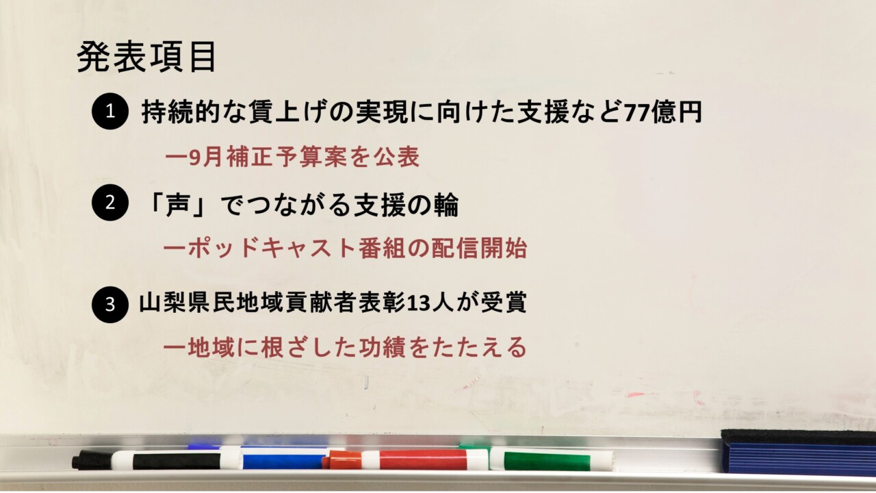 知事は、9月11日より、ポッドキャスト番組「やまなし♥つながる時間 ~気づき、つながり、支え合う~」の配信を開始することを公表した。