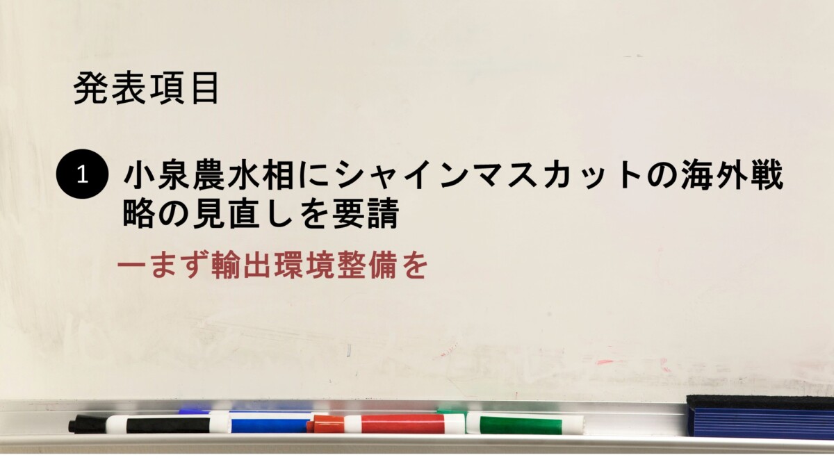 1 小泉農水相にシャインマスカットの海外戦略の見直しを要請/まず輸出環境整備を