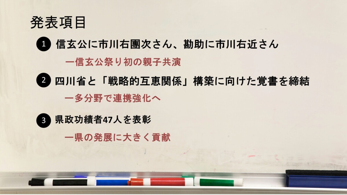 知事は11月4日の記者会見で、来年4月に開催される第52回信玄公祭りの信玄公役に歌舞伎俳優の市川右團次さん、勘助役には右團次さんの二男、市川右近さんが決定したと発表した。